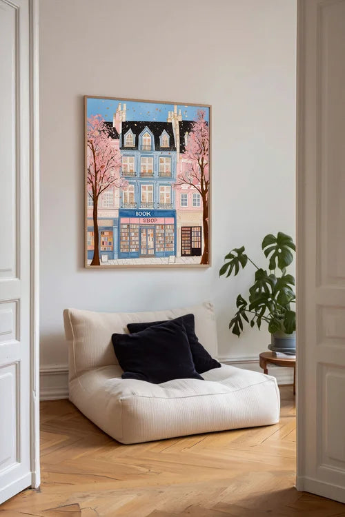 Lose yourself in a street where stories never sleep. Behind the soft glow of this charming bookshop, imagination whispers between pages and petals. The pastel façades, the falling blossoms, and the quiet hum of spring create a world where time slows and wonder lingers.