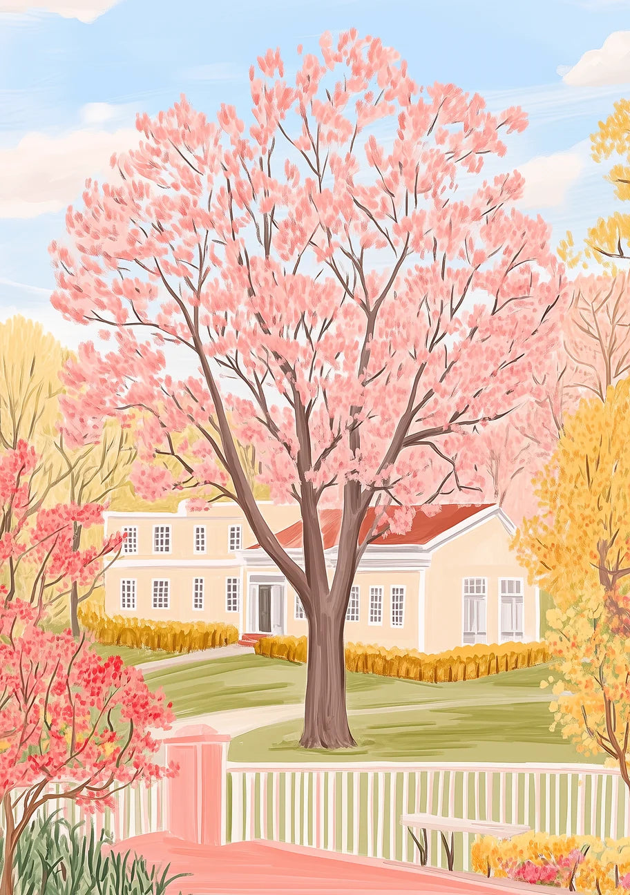 Invite the calm beauty of autumn into your home with this elegant art print, featuring a stately house framed by a magnificent blossoming tree. The warm pastels, golden foliage, and soft pink blossoms capture the serenity of a countryside estate in full bloom. This artwork radiates peace and elegance, making it a perfect centerpiece for your living room, bedroom, or office.