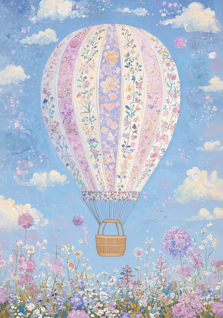 Let your imagination soar with this enchanting art print, featuring a floral hot air balloon drifting gently through a pastel sky filled with blossoms and soft clouds. The artwork combines delicate botanical details with dreamy colors, creating a sense of calm, wonder, and joyful escape. Perfect for brightening any room and adding a touch of whimsy to your decor.